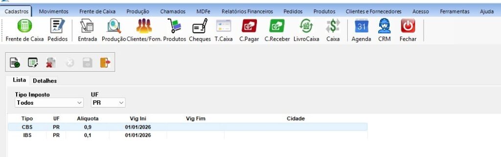 O VendasPCP permite o cadastro e gerenciamento das alíquotas de IBS e CBS por Unidade Federativa, conforme as regras estabelecidas pela Reforma Tributária, possibilitando: