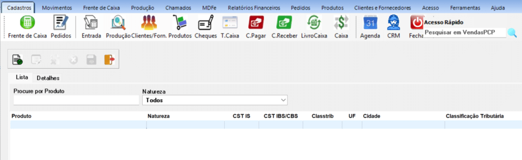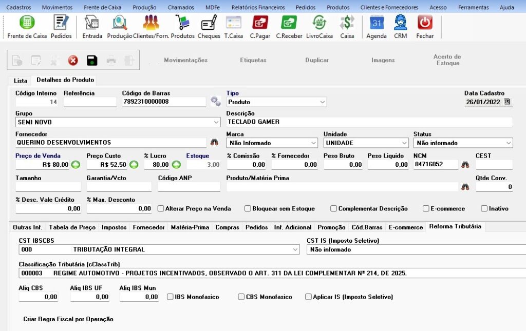 O cadastro de produtos do VendasPCP foi ampliado para incluir os novos campos tributários da Reforma, permitindo: