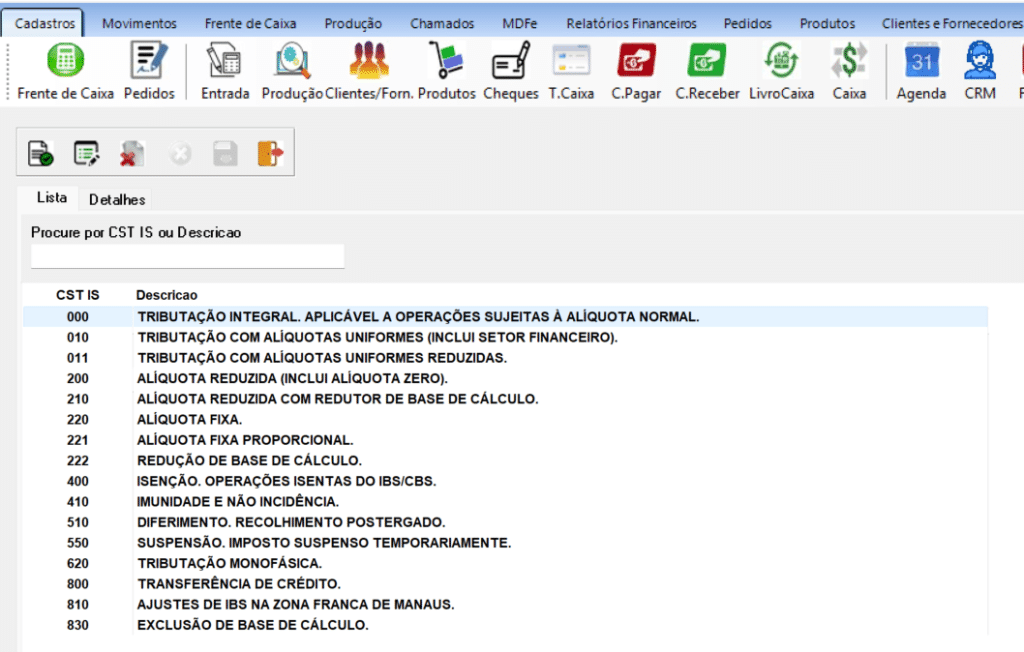 O VendasPCP disponibiliza uma tabela completa de CST do Imposto Seletivo (IS), conforme previsto na Reforma Tributária, permitindo: