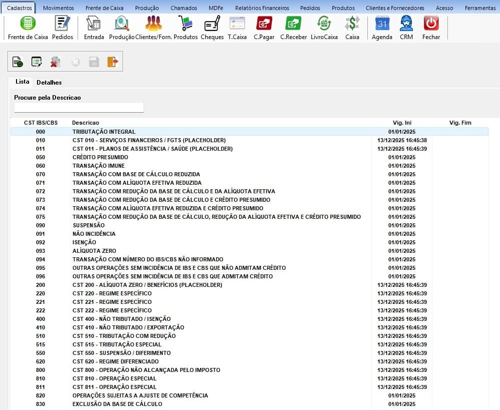 O VendasPCP disponibiliza uma tabela completa de CST IBS/CBS, integrada aos parâmetros e indicadores de tratamento tributário, conforme definido pela Reforma Tributária e pela Lei Complementar nº 214/2025, permitindo: