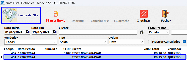 Selecione a venda e clique no botão Transmitir NFe: