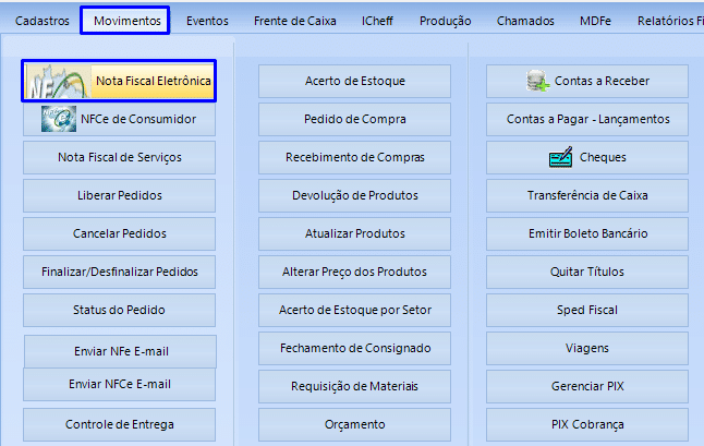 Acesse o menu Movimentos e selecione a opção Nota Fiscal Eletrônica: