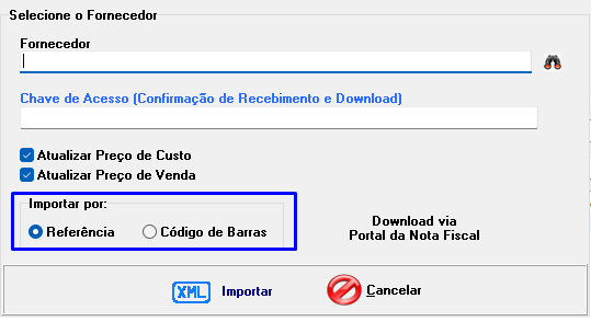 - Importação por Referência ou Código de Barras: Define a forma como o sistema identificará os produtos para vinculá-los ao cadastro existente.
