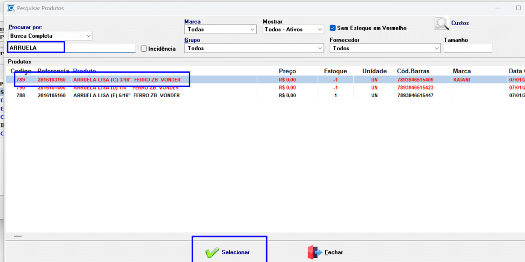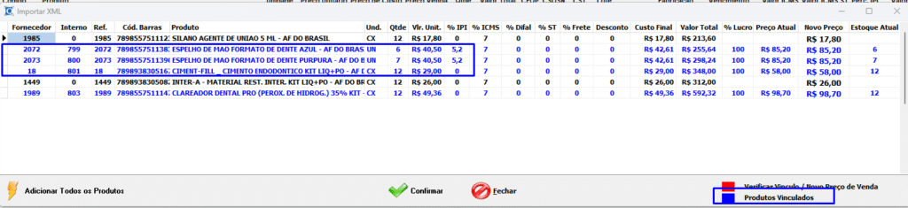 - Os produtos já cadastrados no sistema serão automaticamente vinculados e destacados na cor azul, com o status “Produtos Vinculados”.