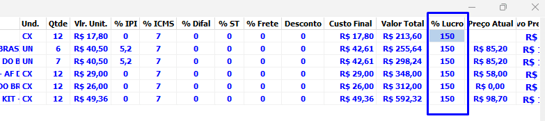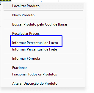 - Para configurar individualmente o percentual de lucro, selecione um produto e informe o valor no campo %Lucro.
