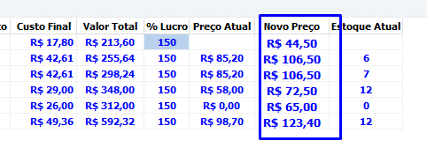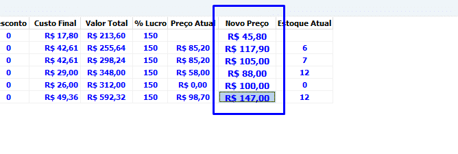 O sistema atualizará automaticamente o preço final de venda. Se preferir, os preços podem ser definidos manualmente inserindo os valores no campo Novo Preço.
