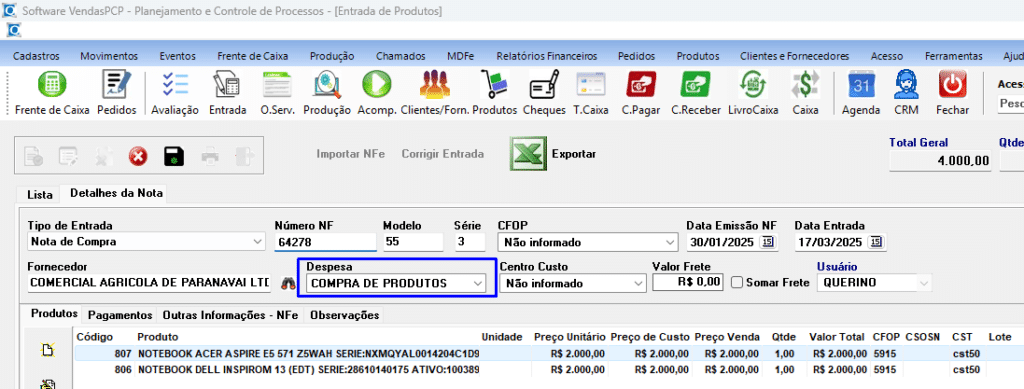 - Atualizar Preço de Custo e Atualizar Preço de Venda: Se essas opções estiverem ativadas, os preços de custo e de venda dos produtos serão atualizados automaticamente no cadastro ao finalizar a entrada.