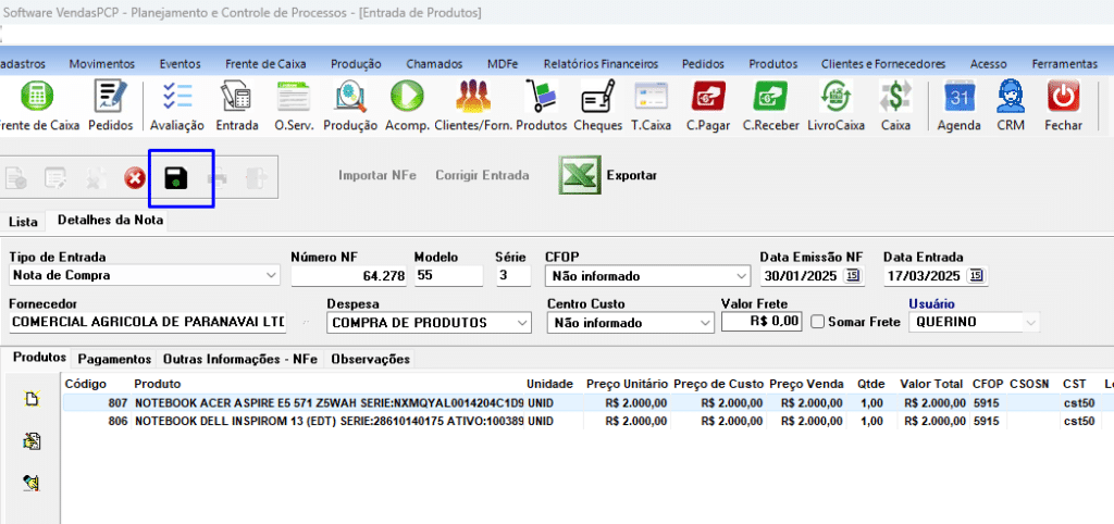 Para finalizar a entrada de produtos no sistema, clique em Gravar.