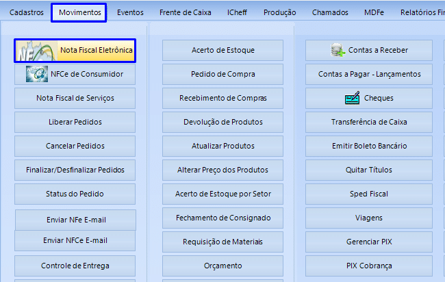 Para realizar o cancelamento de uma NFe, localize o menu Movimentos e selecione a opção Nota Fiscal Eletrônica.