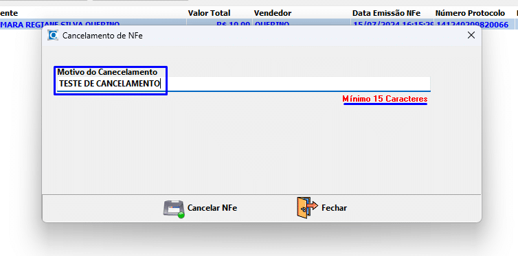Digite o Motivo do Cancelamento: