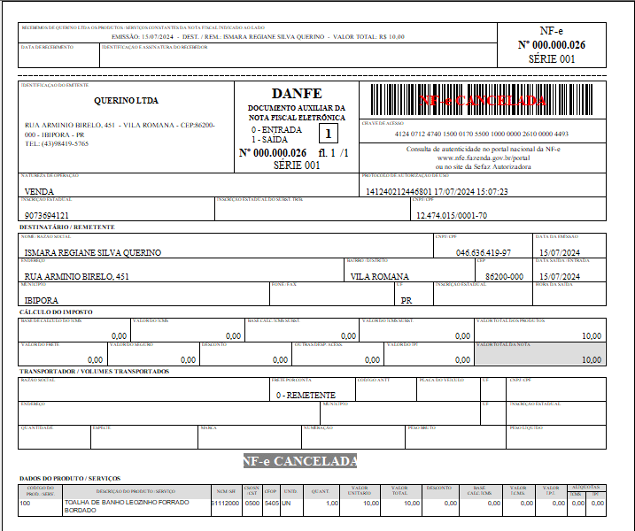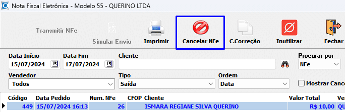 Exemplo de NFe Cancelada: