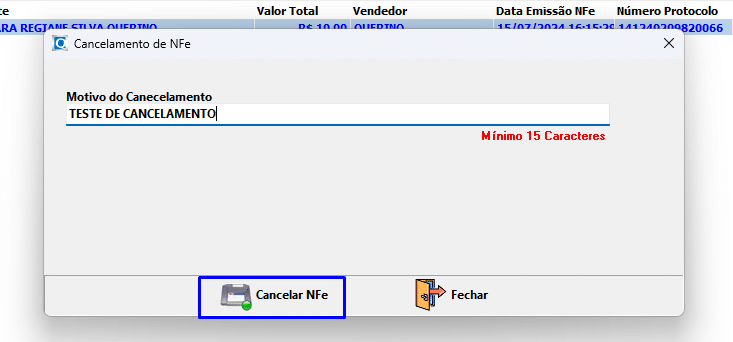 OBS: EM MOTIVO DE CANCELAMENTO É OBRIGATÓRIO TER NO MÍNIMO 15 CARACTERES. CASO CONTRÁRIO O BOTÃO “CANCELAR” PERMANECERÁ DESABILITADO PARA CANCELAMENTO.
